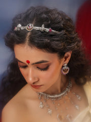 Anoint your crown with divine grace using our Durga Filigree Hair Accessory from the Aadhira Collection. This 925 sterling silver hair ornament artfully combines a traditional Durga wooden carving with modern patterns. Embellished with red talfe, rubies, and moissanites, and melodiously strung with ghungroo, it's a celebration of feminine power from root to tip. Perfect for the woman who knows her thoughts are her most powerful asset.