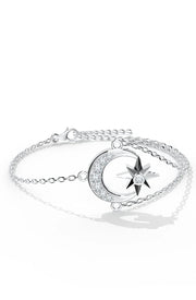 This bracelet, a swirl of light and silver, evokes the tranquil wonder of the night sky. A beautiful crescent moon adorned with moissanites holds a delicate star, like a guiding light tucked within the moon's embrace. It is a timeless and shimmering representation of dreams, rebirth, and the boundless splendor of the universe.