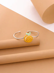 This enamel bracelet showcases a sweet and cute design showing the tart and tasteful lemon! Made with swirly details and featuring a single leaf like a fruit plucked fresh off the tree. The vibrant yellow enamel adds a refreshing pop of colour, while the minimal rhodium plated silver band keeps the look clean and easy to style for everyday wear.