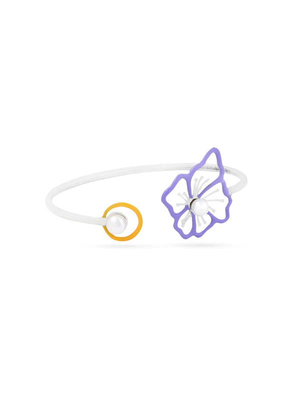 A playful twist on open bracelets- the open pearl enamel bracelet features a floral design, with the flower component of the design being purple, and laden with a striking pearl. The other end of this asymmetrical open bracelet is a yellow circle with an off center pearl. Crafted in rhodium-plated silver for a lasting, tarnish-resistant shine.