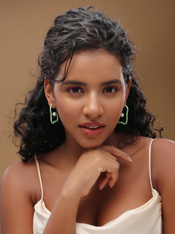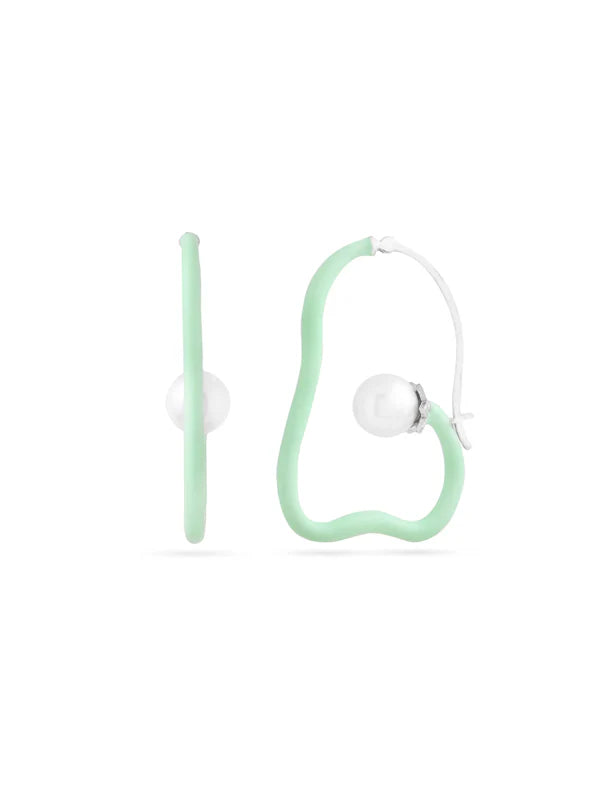 Delightfully fresh, the Pearl and Pear Earrings are a quirky blend of organic form and minimal charm. The mint green enamel outline takes the shape of an abstract pear, while a luminous pearl dangles at the center, creating a subtle contrast. A lightweight, sculptural piece with rhodium plating that brings a sweet twist to everyday styling.
