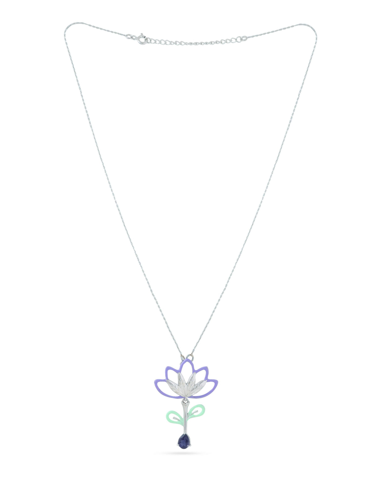 Description: A contemporary take on traditional floral motifs—this necklace features a stylized lotus pendant. The pendant combines soft lavender enamel petals with rhodium plated silver inner detailing, flanked by mint green flourishes that form the stem. An iolite dangles from the base, adding contrast and elegance to the design.