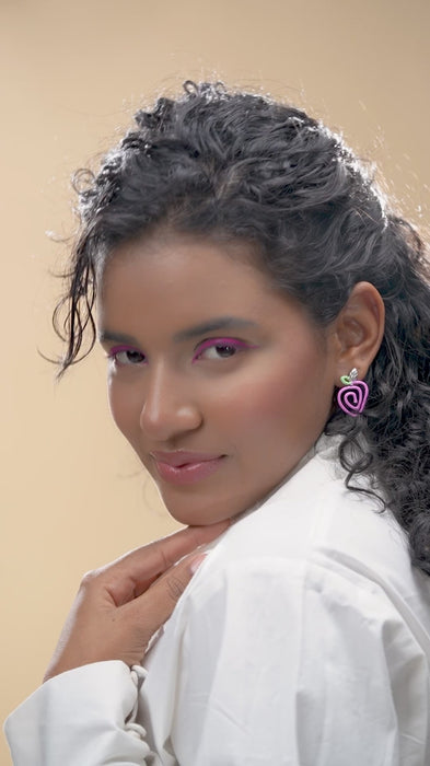 These earrings are an interesting play on design—shaped like strawberries, complete with a vivid red enamel finish, a green vine-like curve, and a delicately crafted leaf detail. This charming composition brings together playful whimsy and artisanal finesse. Inspired by traditional techniques, the earrings are not just cute—they’re a nostalgic nod to handcraftsmanship, reimagined for modern, youthful flair. Ideal for statement-making minimalists.