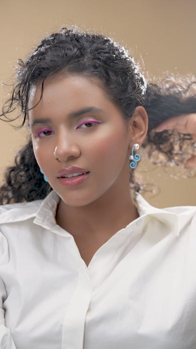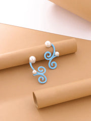 The 'Water Tribe Pearl Earrings' feature swirling blue enamel elements reminiscent of flowing waves, accented with luminous pearls at varying points. Their sculptural design brings fluidity and form together, echoing natural movement. Lightweight yet visually striking, these earrings blend softness with structure—ideal for those who lean toward designs that feel serene, sculptural, and distinct.