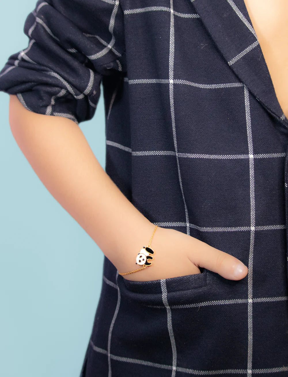 Celebrate the playful spirit of pandas with this exquisitely crafted bracelet from our Kid's Collection. This piece, made from 925 sterling silver and beautifully coated in 24K gold plating, features charming black and white enamel embellishments that capture the essence of panda's classic coloration. It's a delightful accessory that brings a touch of wildlife wonder to your child's jewellery collection.