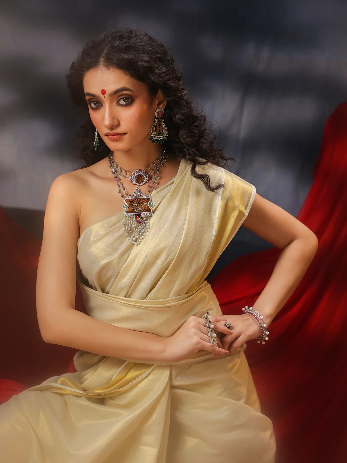 A magnificent tribute to divinity, this multi-layered necklace is adorned with sacred symbolism. Featuring "Ma" and "Navdurga" engraved in rich wooden panels, framed by sterling silver filigree, moissanites, and vibrant navratna gemstones, it radiates spiritual grandeur. The cascading pearls and ghungroo chain add an ethereal charm, making this an exquisite blend of devotion and artistry. A statement piece that embodies strength, blessings, and timeless tradition.