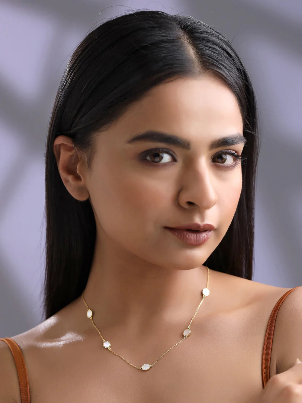 A single, delicate chain adorned with five oval-shaped inlays, each capturing a subtle shimmer—balanced, refined, and effortlessly elegant.