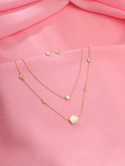 A symphony of geometric grace, this necklace set brings a refined edge to timeless elegance. Delicately linked, the layered necklace features pentagon-shaped charms, each glowing with the soft iridescence of mother-of-pearl. Paired with matching stud earrings, this set is a seamless blend of structure and sophistication—perfect for those who appreciate modern design with a touch of ethereal beauty.