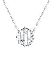 This pendant honors the timeless beat of the universe by capturing a heavenly symphony in silver. Two bright stars and a crescent moon are linked together by intricate rope-braid accents inside a dazzling ring of moissanites. Like the stars above, it shines with a soft brilliance, a talisman of cosmic awe.