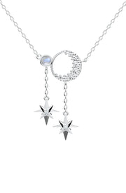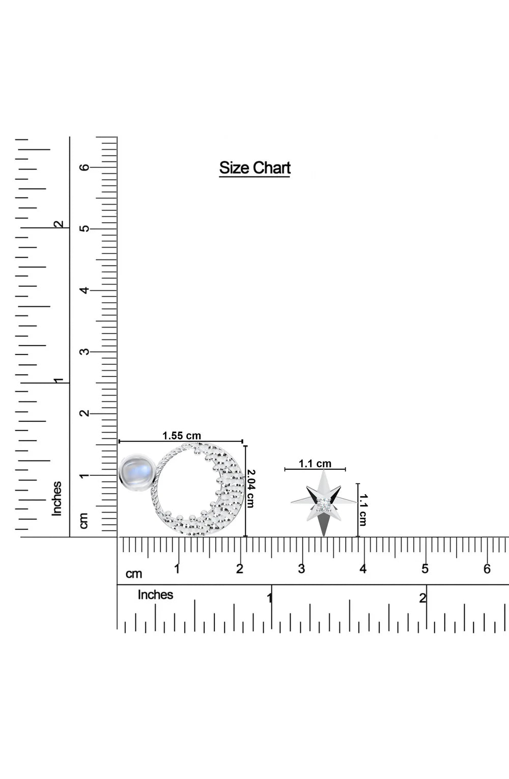Framed within a perfect circle, the crescent moon hangs like a guardian of the night, cradling dreams and quiet wishes. A luminous moonstone rests beside it, mirroring the glow of a moonlit sky. From both, delicate stars dangle like whispers of constellations- a promise of the unending vastness that light blasts through!