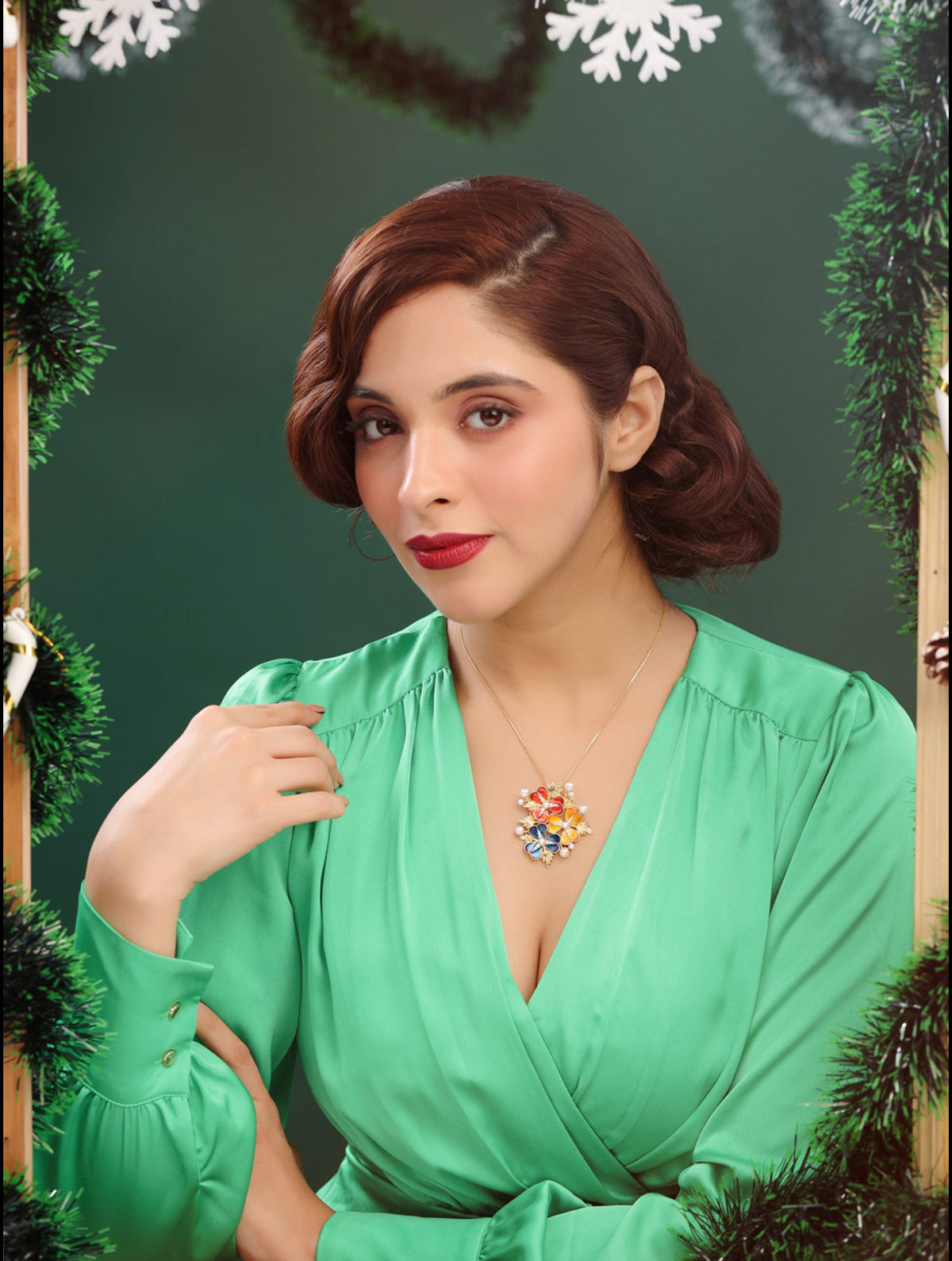 Description: A bloom of festive hues, a dance of pearls—this pendant captures the magic of a winter garden in full splendor. Vivid enamel flowers, kissed by delicate moissanite trails, burst into life, while pearls glow like snowflakes caught in golden leaves. A piece as radiant as holiday joy, designed to make every moment feel like a celebration.