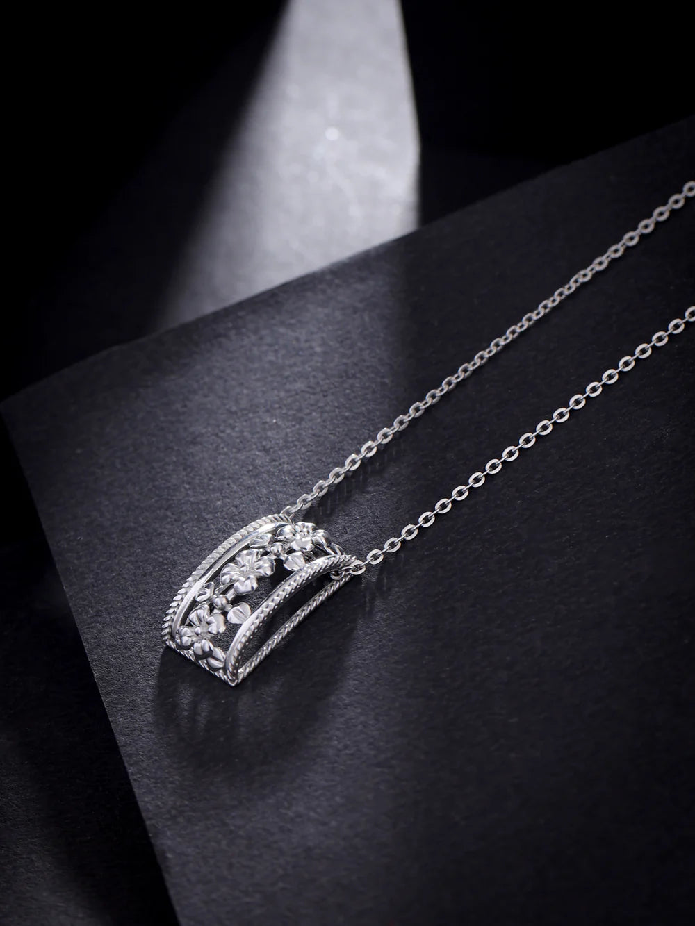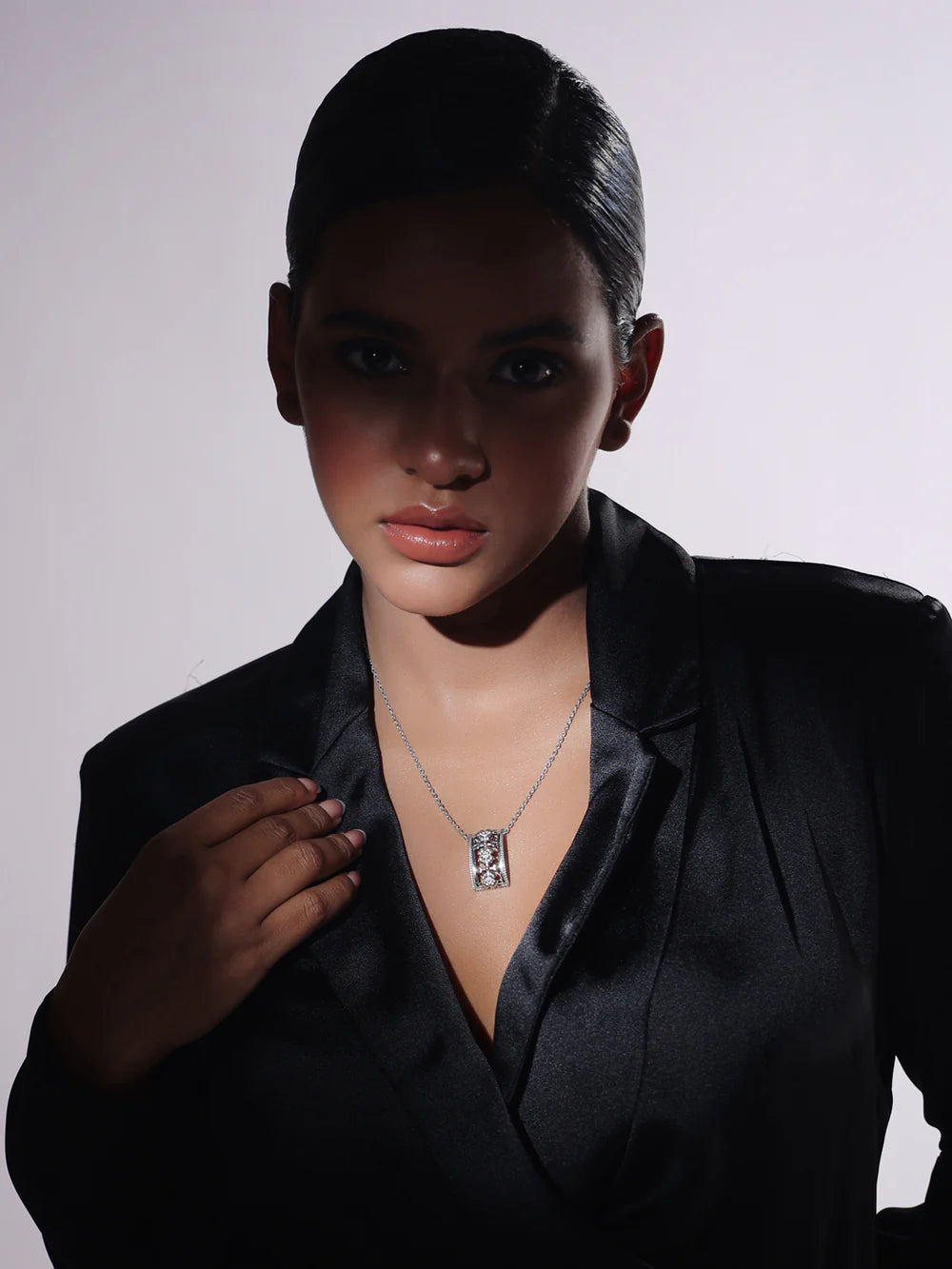 Adorning yourself with the symmetrical beauty of flowers reimagined in a modern style with this pendant from our Lumina Collection. Coated in silver rhodium, this 925 sterling pendant combines timeless elegance with contemporary design.