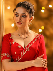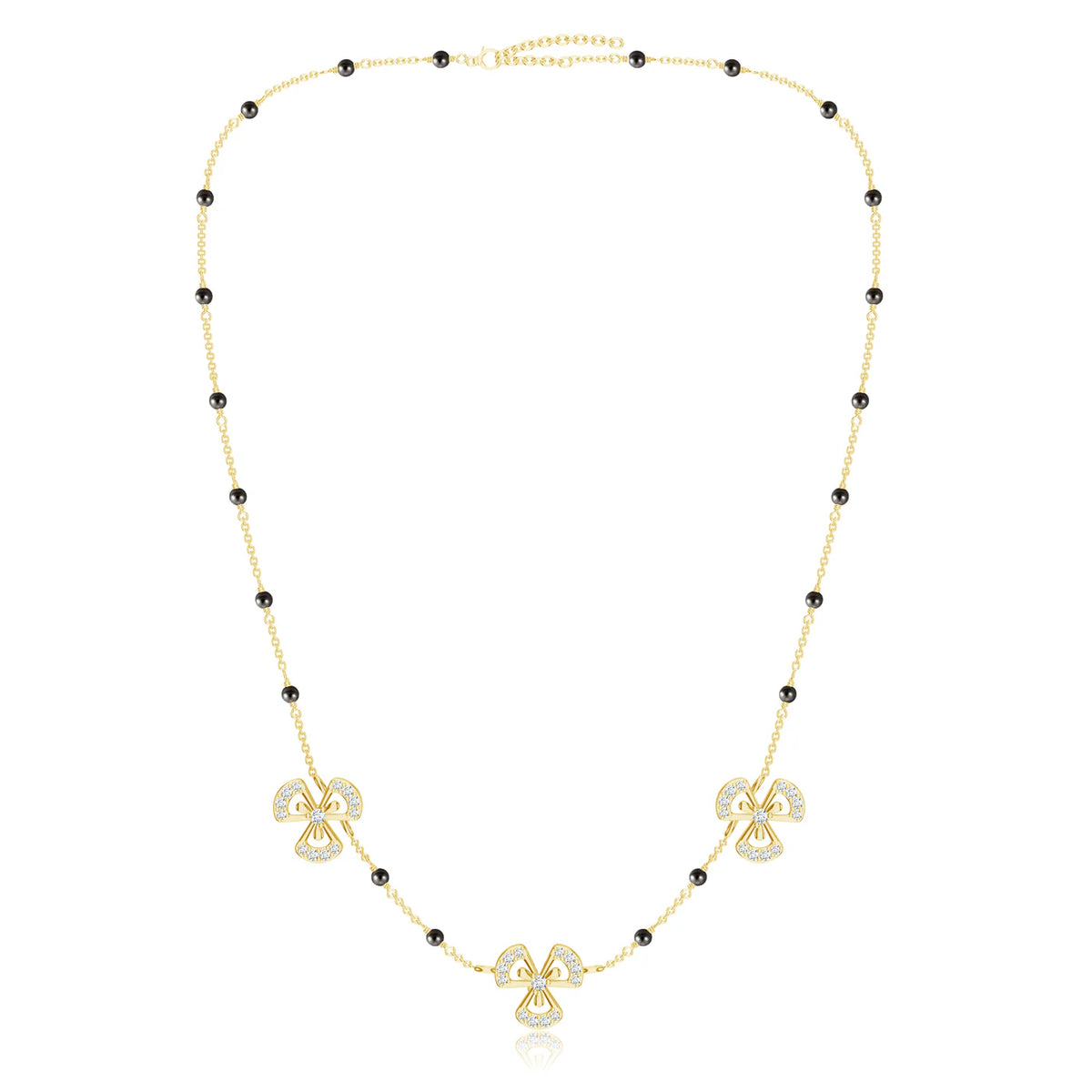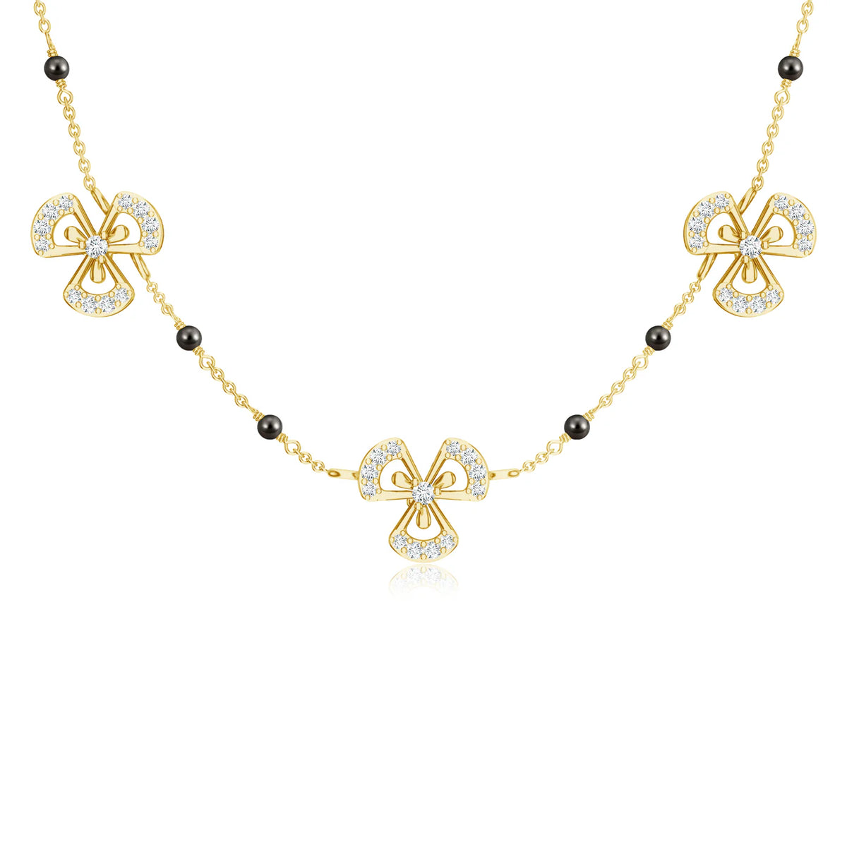 A timeless testament to enduring bonds, this exquisite mangalsutra combines symmetry and symbolism, drawing inspiration from the elegance of a tennis bracelet and the allure of nature. The classic black beads provide protection, while the delicate clover-shaped design, embellished with dazzling moissanites, symbolizes love, luck, and prosperity
