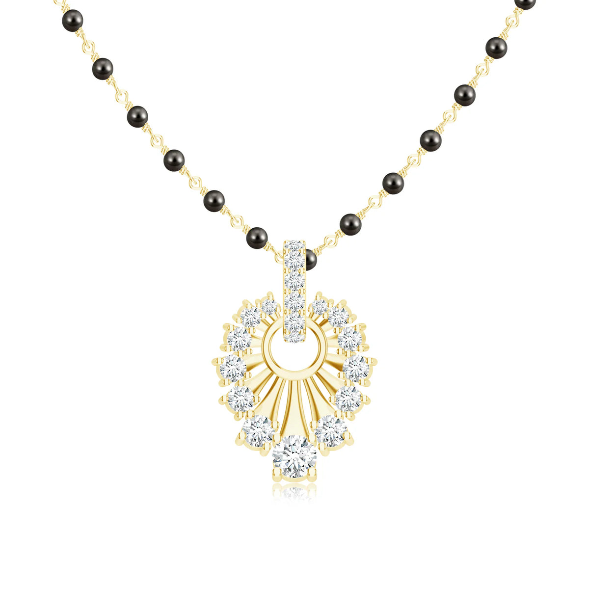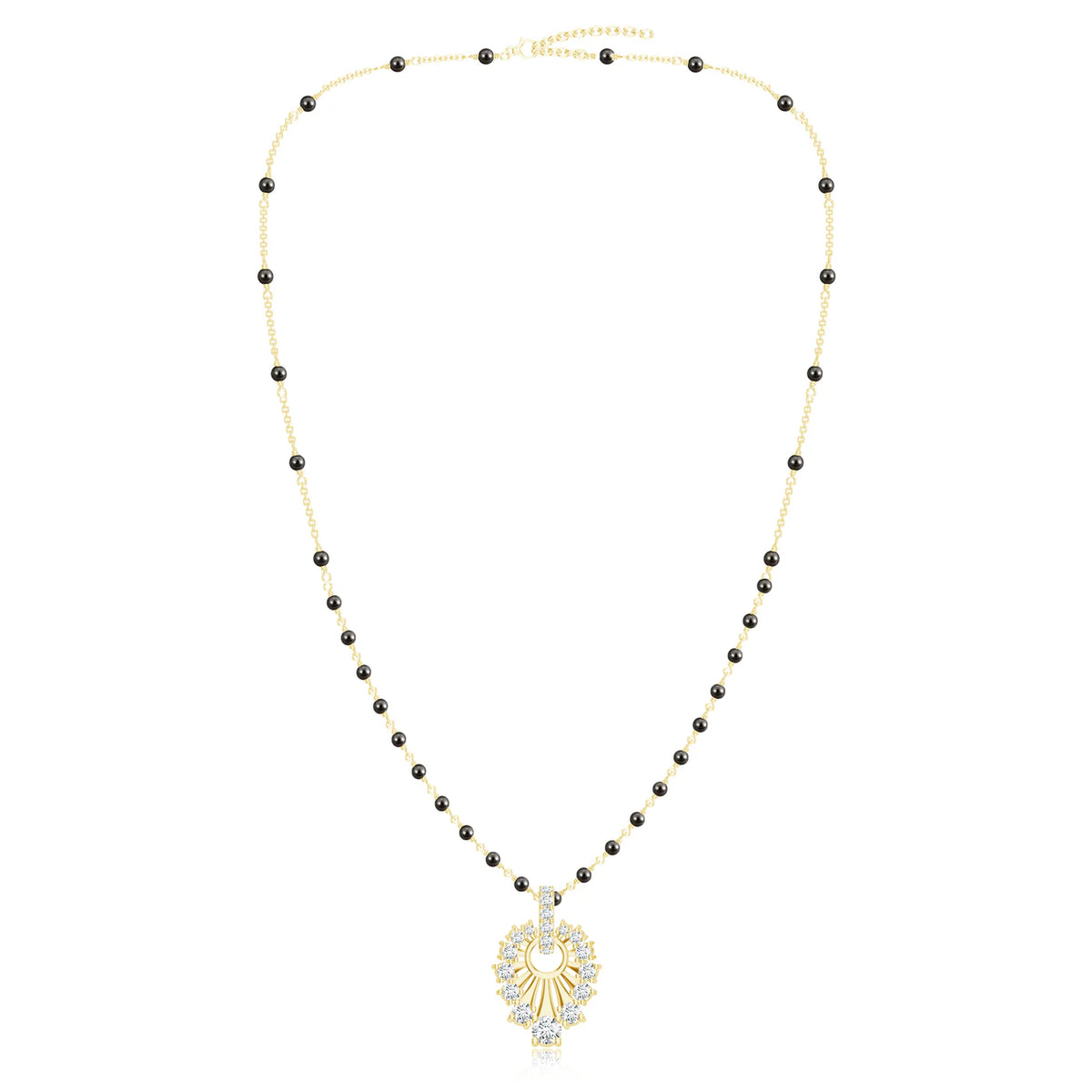 This mangalsutra is a representation of love that is as bright and unwavering as the sun. Its sun-inspired pattern, adorned with dazzling moissanites, expresses the beauty of unending love. The traditional black bead chain, which is thought to fend off nazar, adds a spiritual touch, transforming this mangalsutra from an adornment into a blessing of dedication, protection, and unending unity.