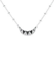 Textured with intricate concentric triangles, this crescent moon pendant is a fusion of classic symbolism and bohemian artistry. A piece that bridges the mystical and the modern, it carries the quiet elegance of celestial motifs while echoing the free-spirited essence of handcrafted design. A timeless adornment for those drawn to both tradition and individuality.