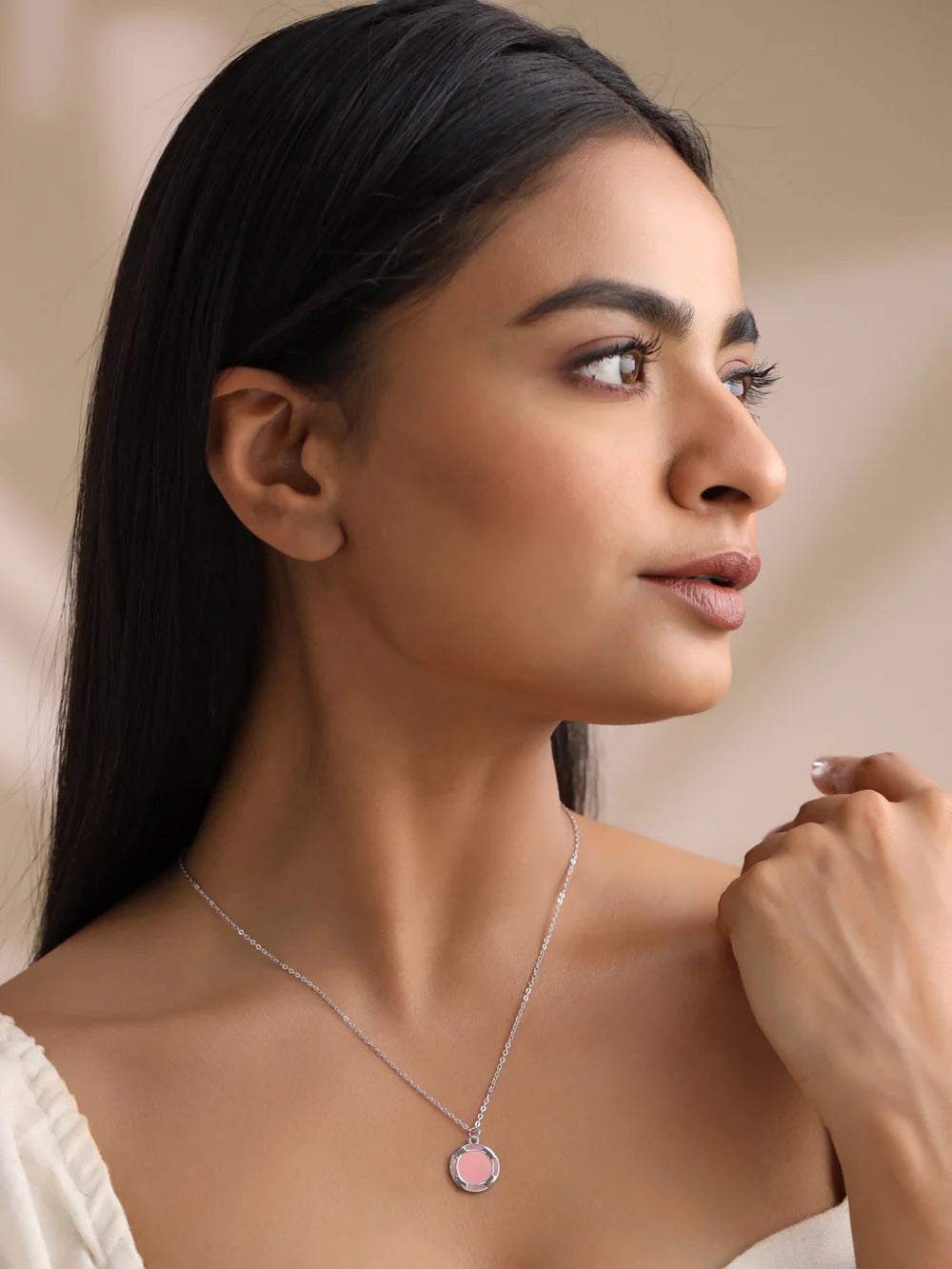 Framed in a striking silver rhodium finish, the soft pink enamel inlay adds a delicate touch of color, catching the light with every movement. Inspired by the charm of casino chips, this necklace is a playful yet sophisticated piece—perfect for those who love to take chances and shine while doing it.