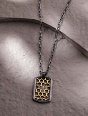 Delve into the divine with this honeycomb pendant, symbolizing wisdom and hard work, from our Men's Collection. This 925 sterling silver pendant is elegantly dual plated in 24K gold and black rhodium, infusing it with both a luxurious and sophisticated aesthetic. It's designed for the discerning man who values symbolism and style.