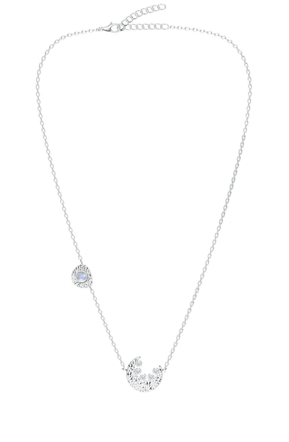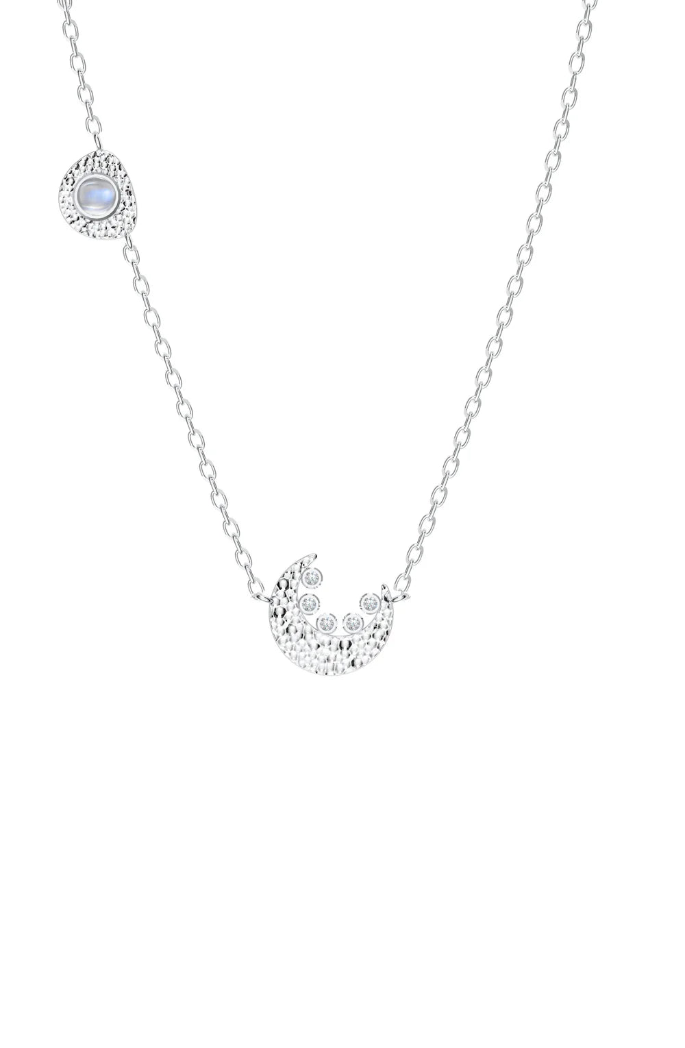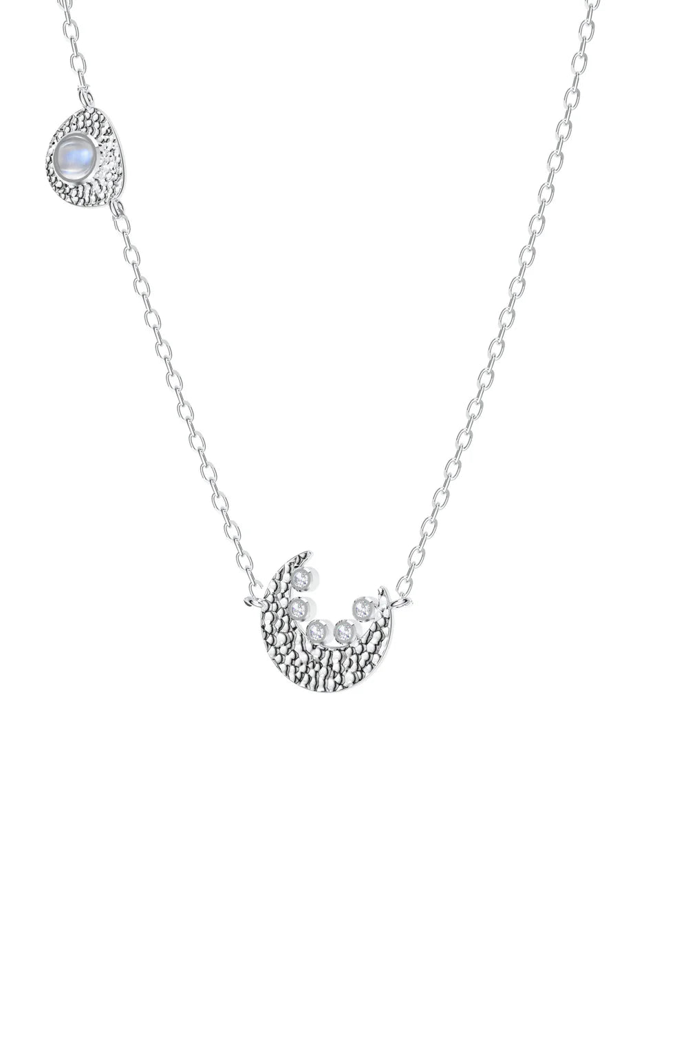 This textured crescent moon pendant embodies the silent enchantment of the night, as though it were taken from the sky and encased in silver. On the left is a glowing moonstone that serves as a reminder that light exists even in the dark. The ever-evolving yet timeless crescent symbolizes rebirth, intuition, and the invisible forces that lead us.