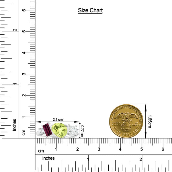 - Embellished with moissanites, lemon quartz, and rhodolite garnet