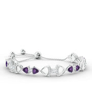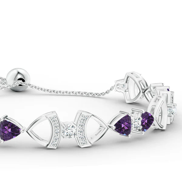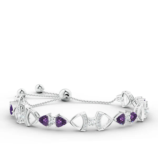- Features a trillion-shaped amethyst stone and moissanite