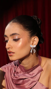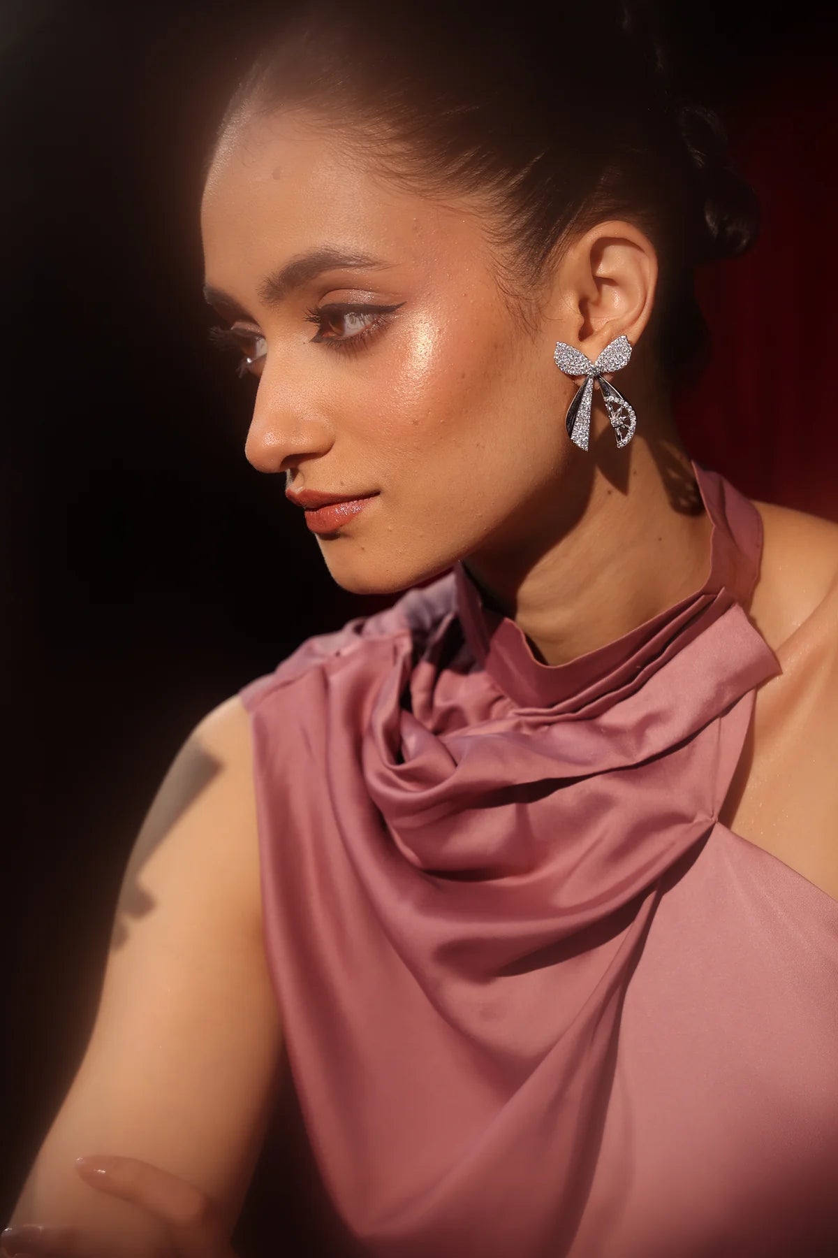 Studded with moissanite, arranged in a classic bow and floral detail.