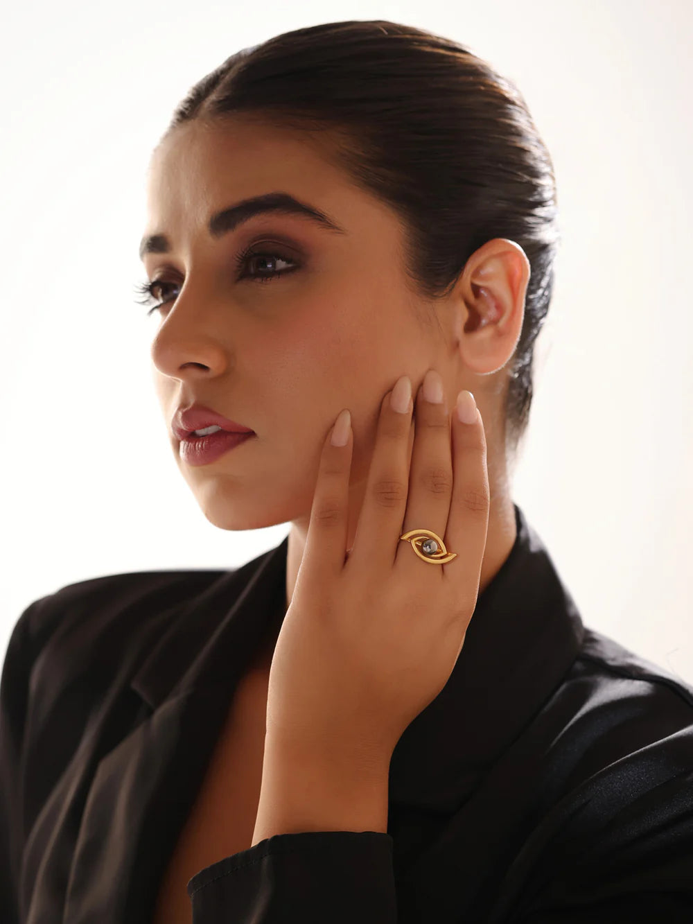 Capture the mystique of the evil eye with this abstractly designed 925 sterling silver ring from our Lumina Collection, beautifully plated in 24k gold and real rhodium and black for a striking contrast.