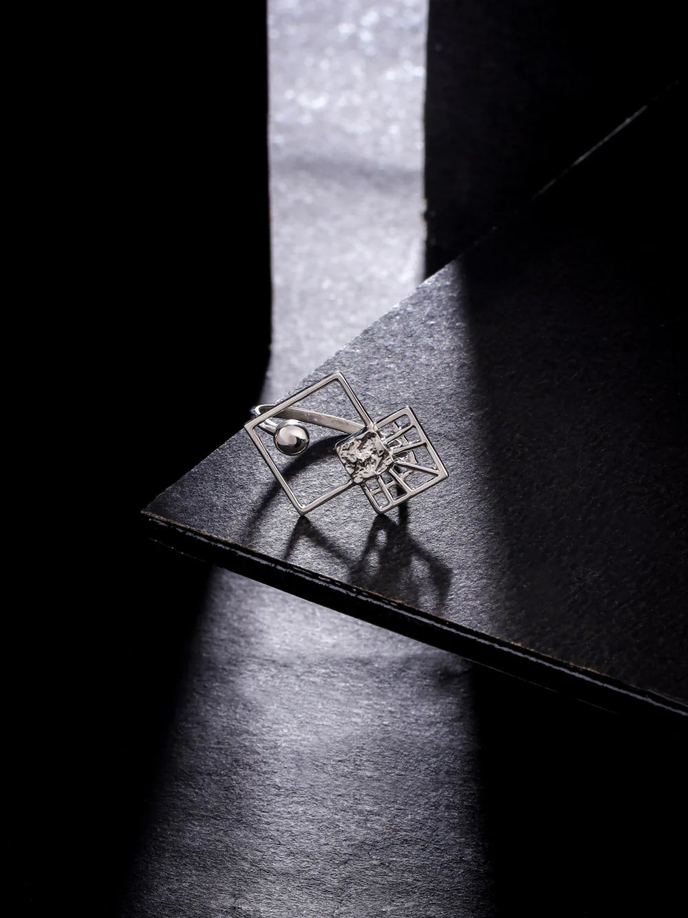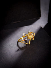 Experience the geometric elegance of this 925 sterling silver ring from our Lumina Collection, featuring a mix of shapes and jali patterns, plated with 24k gold and real rhodium and a black finish for a touch of opulence.