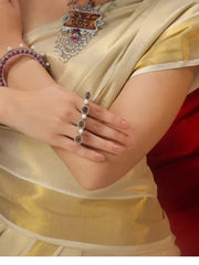 This exquisite three-finger ring is a masterpiece of devotion and design. Adorned with four sacred charms—a trishool and a lotus, gracefully interwoven with delicate pearls—it embodies spiritual strength and divine beauty. The side profile reveals intricate floral filigree work, adding a touch of vintage elegance. A bold yet graceful statement, this ring is a seamless blend of tradition and contemporary artistry.
