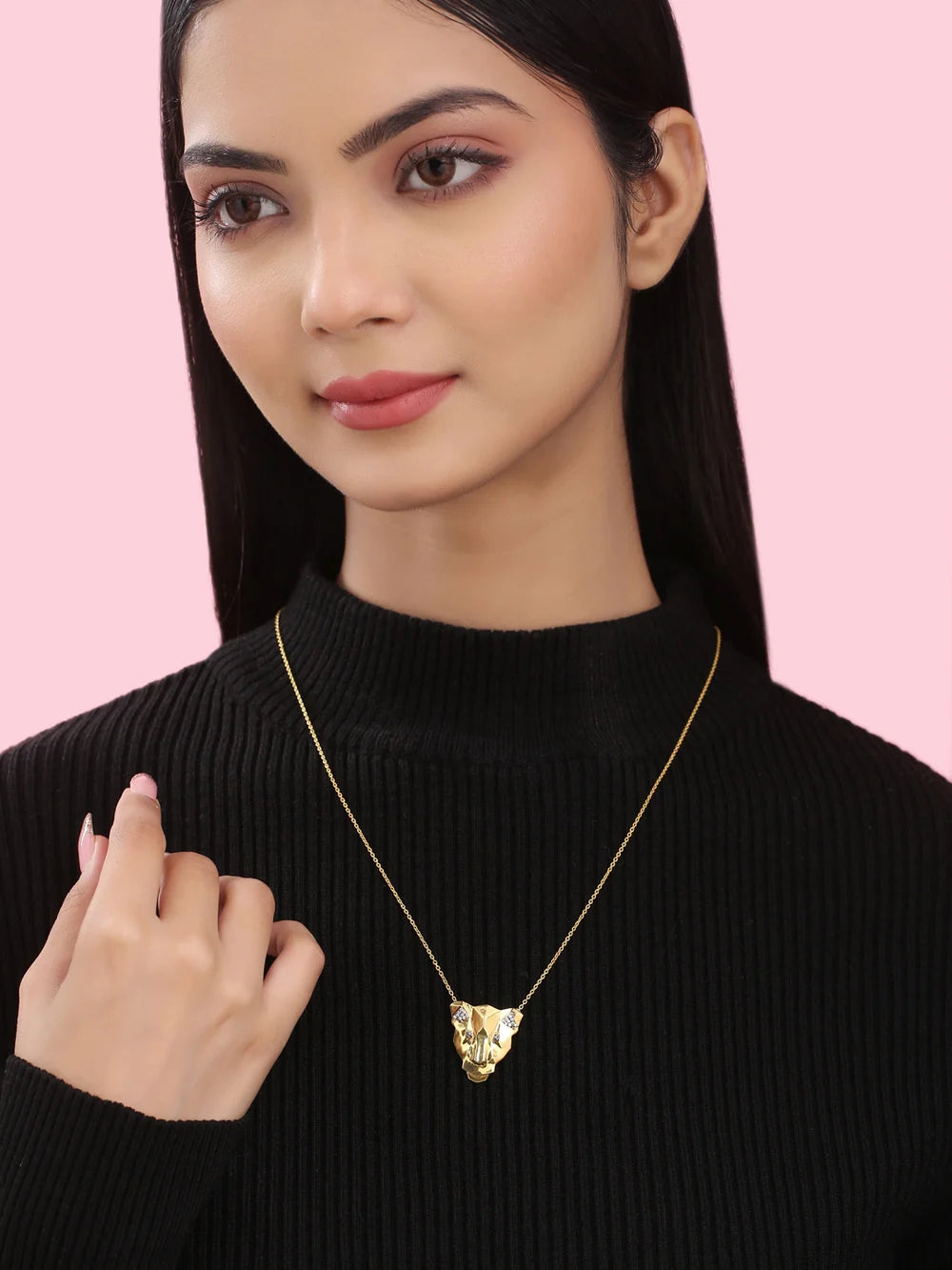 A predator of the night, fierce yet composed—this panther pendant embodies silent strength. Its angular, faceted design mirrors the sharp instincts of the wild, while moissanite-studded eyes gleam with quiet intensity. The gold finish lends depth to its sculpted form, capturing the raw power and grace of this majestic creature. A statement of confidence and control, this piece is for those whose presence alone speaks volumes.
