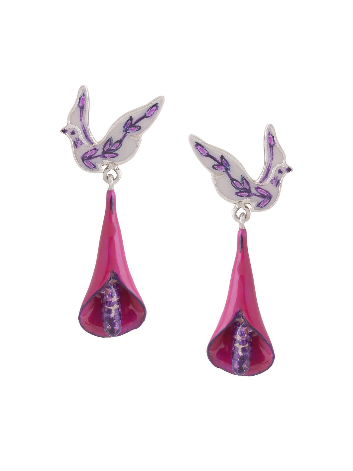 The delicate design evokes a sense of wonder and awe, since its muse is doves flying amid the beauty of blooming flowers. These purple enamel earrings with dove motifs and floral details are a timeless piece that adds a subtle yet powerful touch of nature's elegance to any look, carrying the spirit of hope and transformation with every wear.