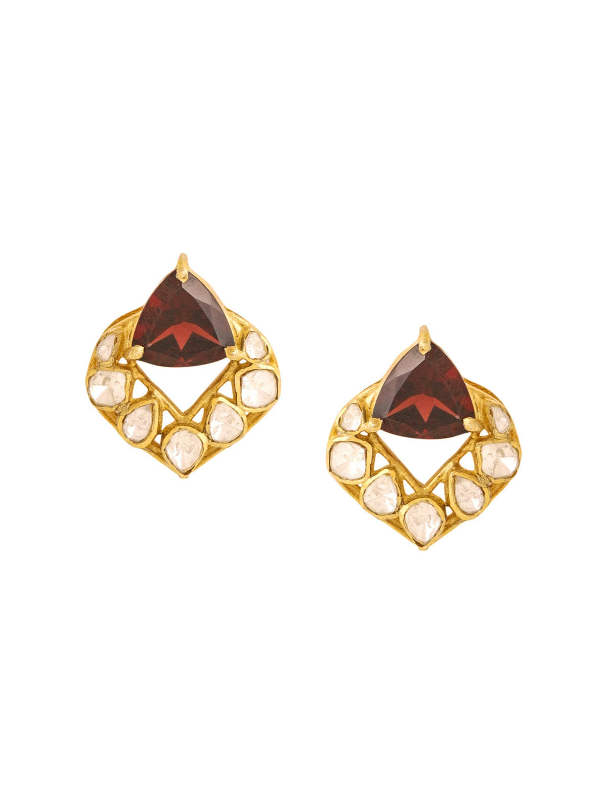 Material:These earrings are crafted from 925 sterling silver, featuring trillion-cut garnet and faceted polki, plated with 24K gold for a regal finish.