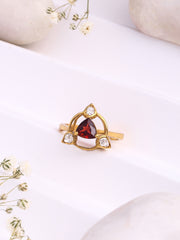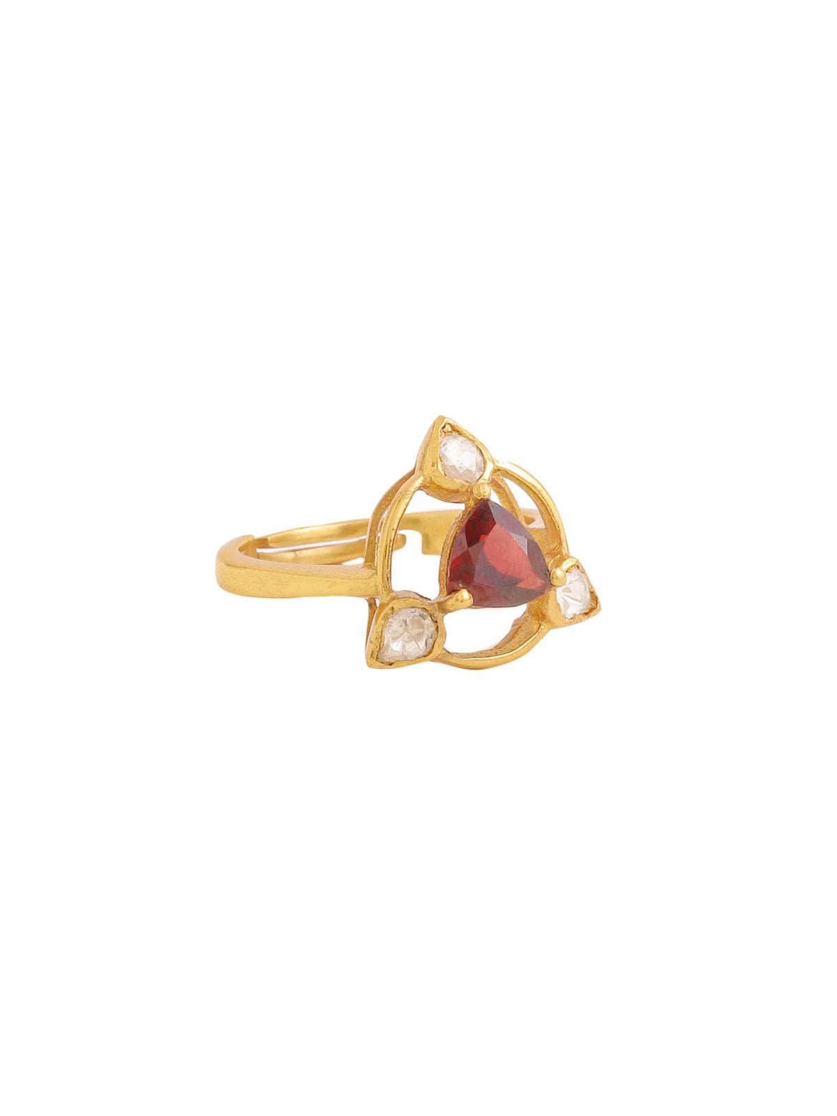 Features: The ring showcases a trillion-cut garnet and faceted polki, beautifully complemented by a 24K gold plating for an opulent finish.