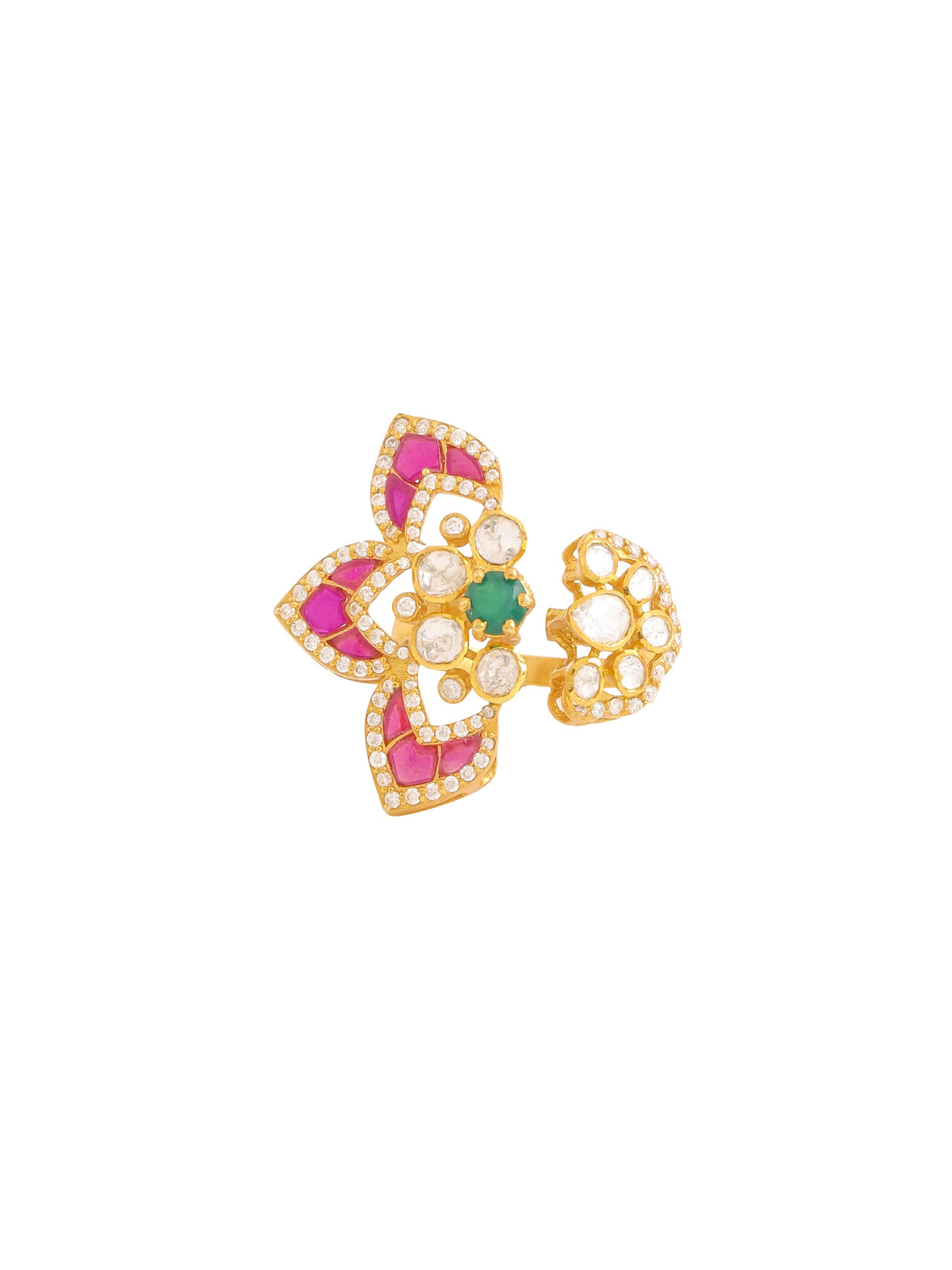 Material: Crafted from 925 sterling silver, this ring features green onyx and Moissanite polki, set off with red talfe.